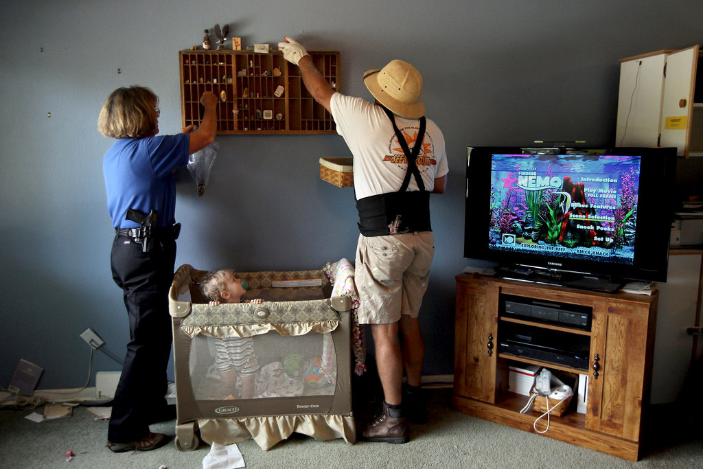 Ngày 5/10, bé Chase Milam, 1 tuổi, chứng kiến một đội trục xuất gỡ đồ dùng khỏi ngôi nhà đã bị tịch thu trong cuộc khủng hoảng nhà ở tại Mỹ.