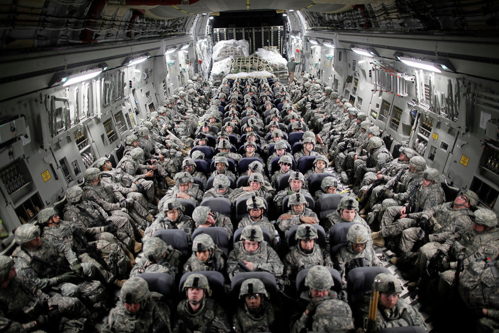 Vào ngày 5/4, quân đội Mỹ mặc quân trang đầy đủ ngồi trên một chiếc máy bay vận tải quân sự C-17 từ căn cứ không quân Manas ở Kyrgyzstan đến Mazar-i-Sharif, Afghanistan.